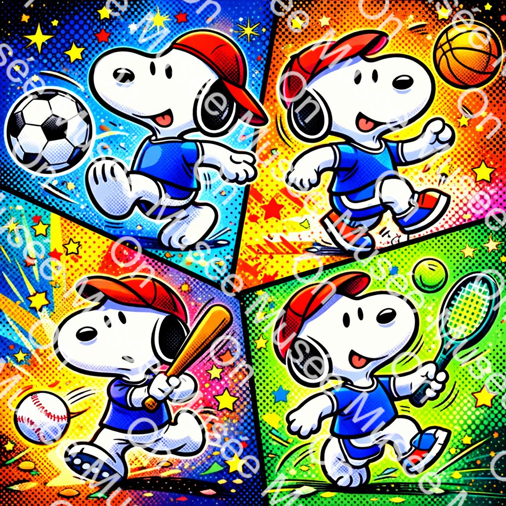 This vibrant pop-art composition celebrates movement, joy, and the universal language of sport. Through bold colors, comic-style panels, and dynamic halftone textures, Snoopy appears across multiple athletic moments—each capturing energy, optimism, and playful determination. The artwork reflects how sport transcends competition, becoming a pure expression of passion, balance, and fun.