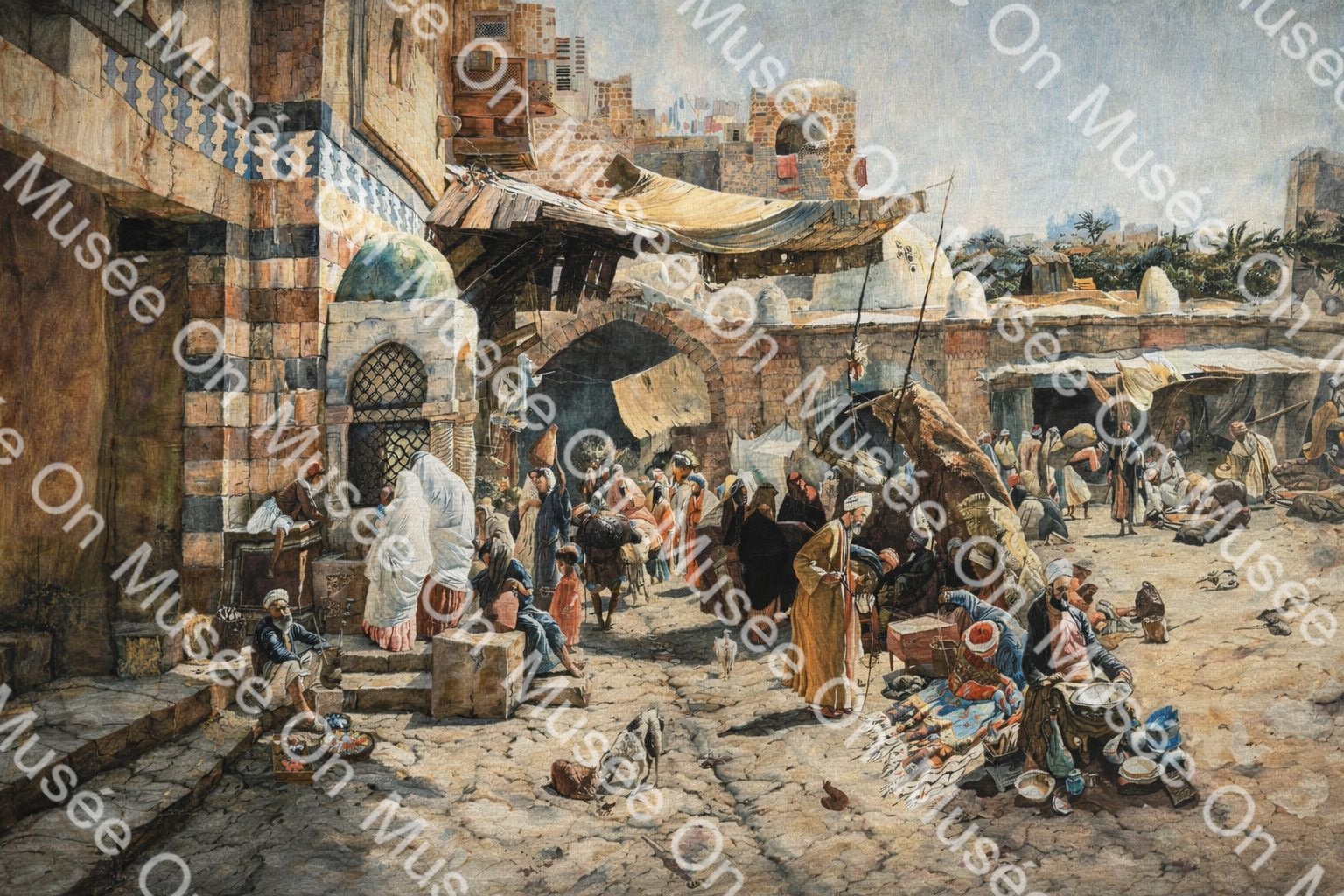 This artwork captures a vivid moment in a historic Middle Eastern marketplace, where daily life unfolds beneath stone arches shaped by centuries of civilization. The composition draws the viewer into a bustling souk filled with merchants, travelers, and townspeople, each absorbed in quiet exchanges and purposeful movement. Warm earth tones dominate the scene, reflecting sun-worn stone, textured walls, and the timeless fabric of the city, while subtle blues and greens from domes and garments add balance and depth.