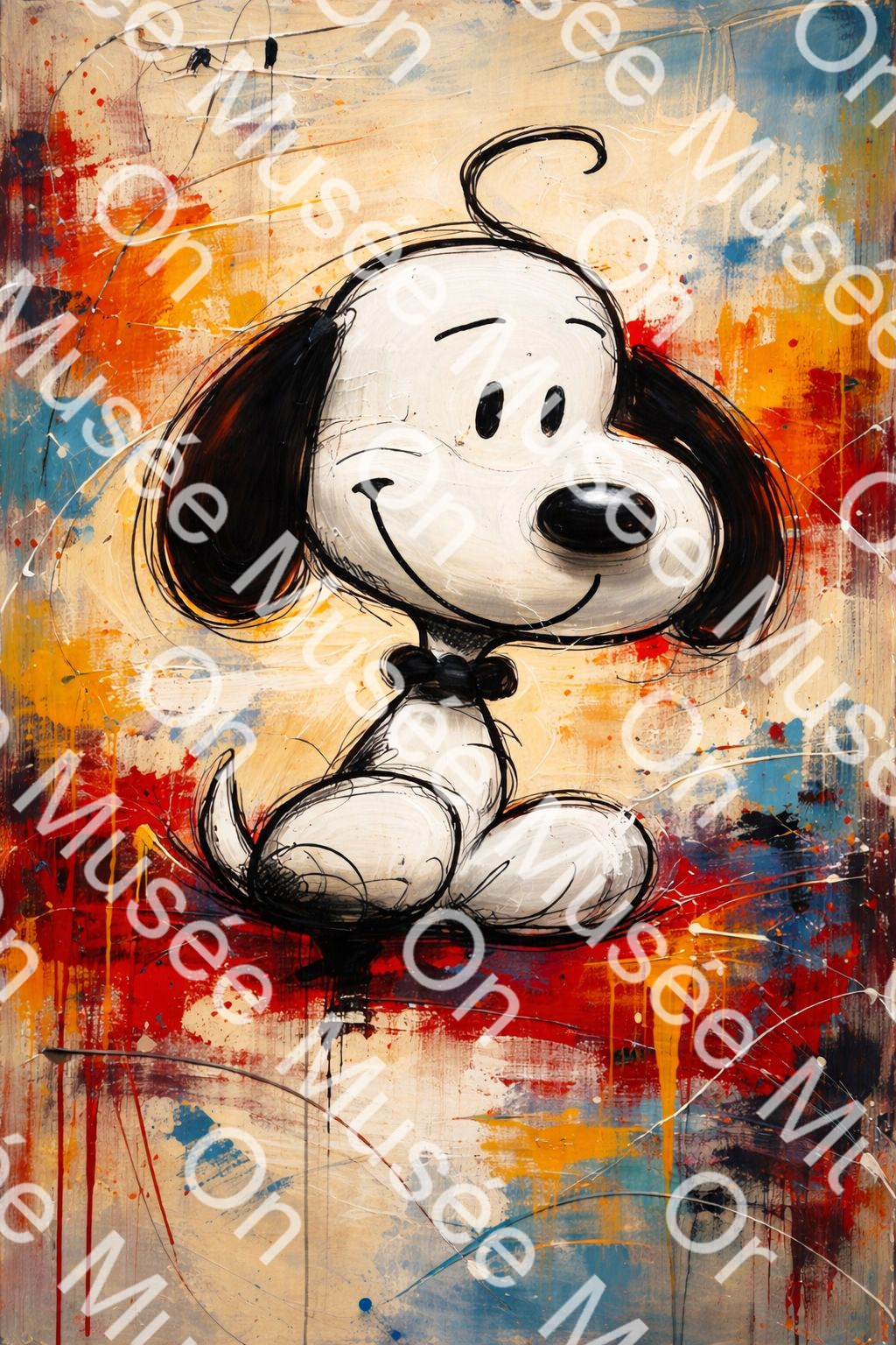 This portrait reimagines a timeless, cheerful character through a bold contemporary lens. Rendered in expressive black lines and soft white tones, the figure radiates warmth, innocence, and quiet confidence. The vibrant abstract background layered with energetic strokes of red, orange, blue, and gold creates a dynamic contrast that elevates the simplicity of the subject into a powerful modern statement. The interplay between playful nostalgia and refined artistic technique gives the artwork emotional depth, making it both comforting and visually striking. It invites the viewer to pause, smile, and reconnect with a sense of joy that feels both familiar and renewed.