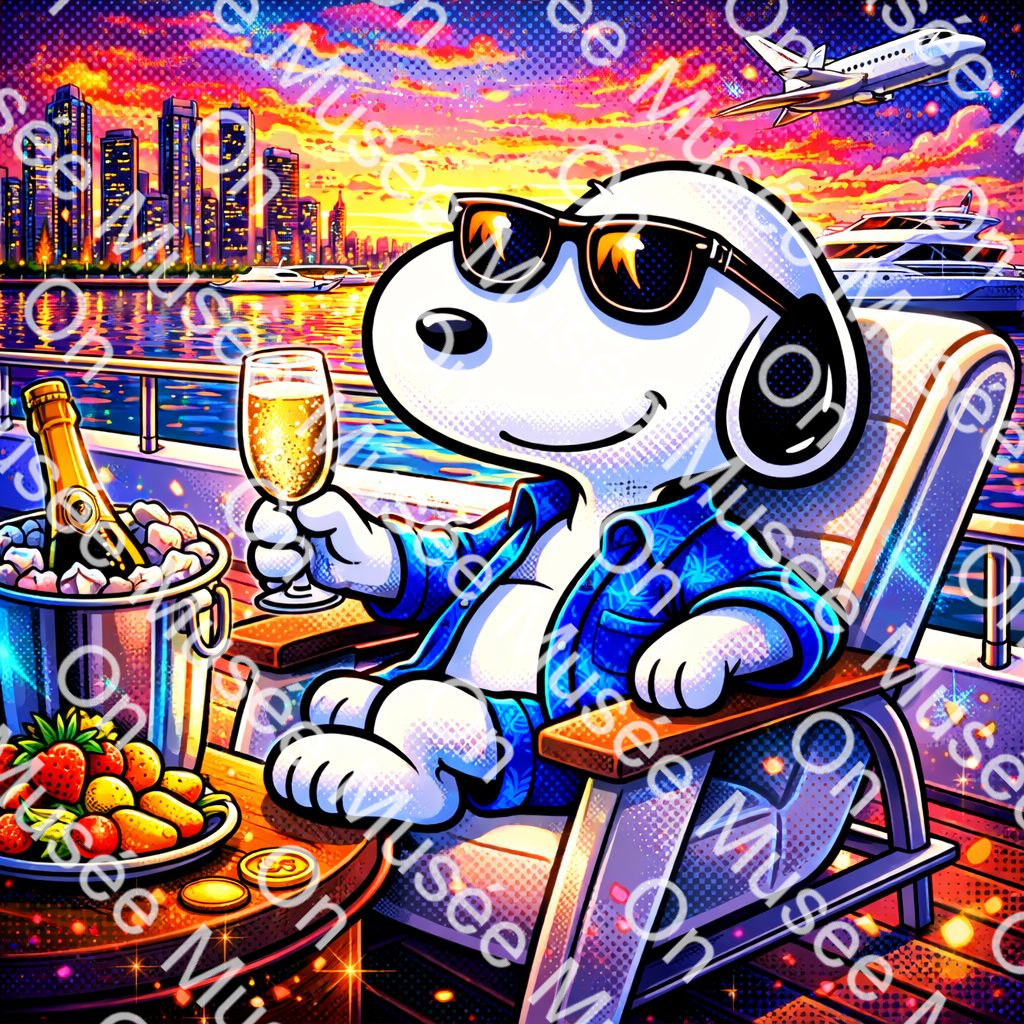 This pop-art portrait captures luxury not as excess, but as ease and control. Seated aboard a yacht at golden hour, Luxury Snoopy reflects a life of balance where success is quiet, confidence is effortless, and time is the ultimate currency. Rich colors, reflective waters, and refined details elevate the moment into a modern symbol of achievement and freedom