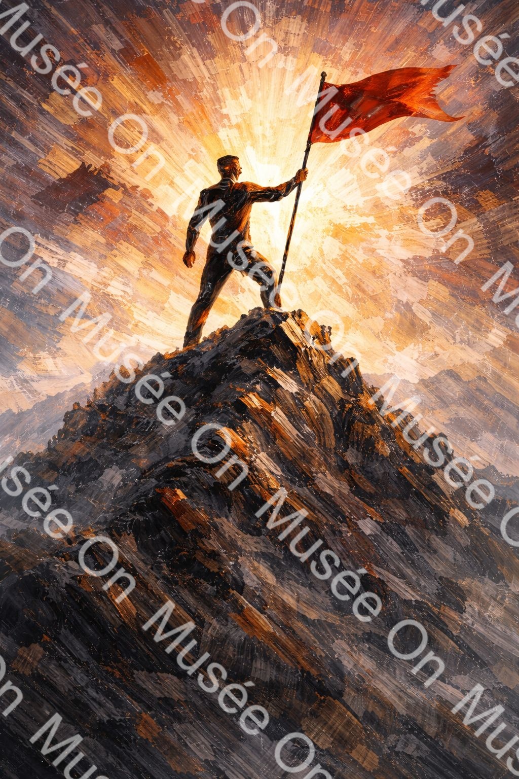The red flag embodies authority, determination, and a clear declaration of purpose, while the radiant golden light behind the figure signifies influence, recognition, and impact beyond the self. The steep, rugged mountain reflects the difficult decisions, risks, and sacrifices inherent in leadership.
